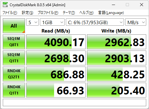 ↑ストレージはGen 4×4な高速タイプのNVMe SSDが1TB。