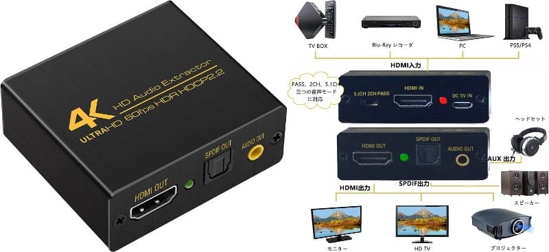 気になる人はAmazonなどで「HDMI 音声分離」で調べてみてください。