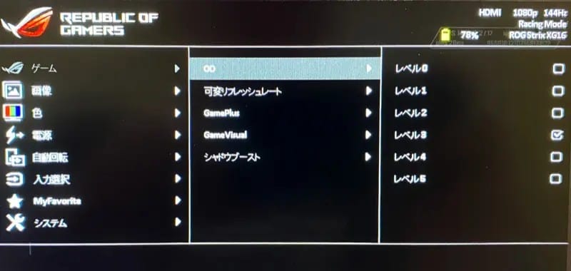 さらに、オーバードライブ機能を使えば6段階で応答速度を調整できます。