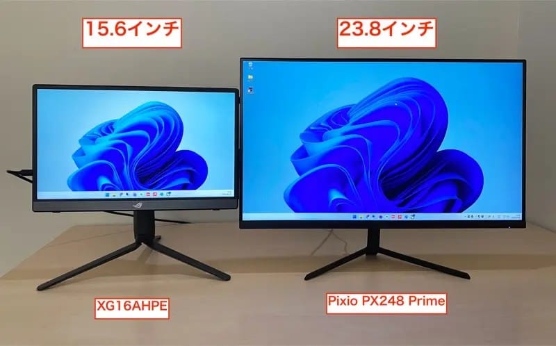 ゲーミングモニターで人気のある23.8〜24.5インチクラスと比較すると、XG16AHPEは「かなり小さい」です。