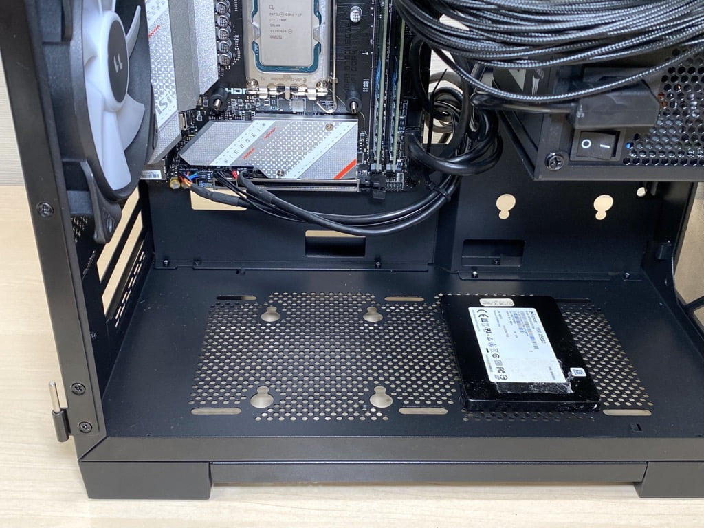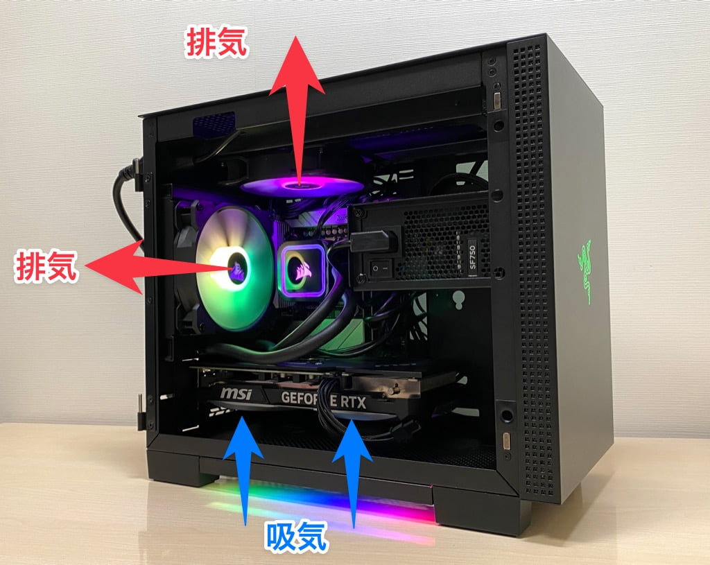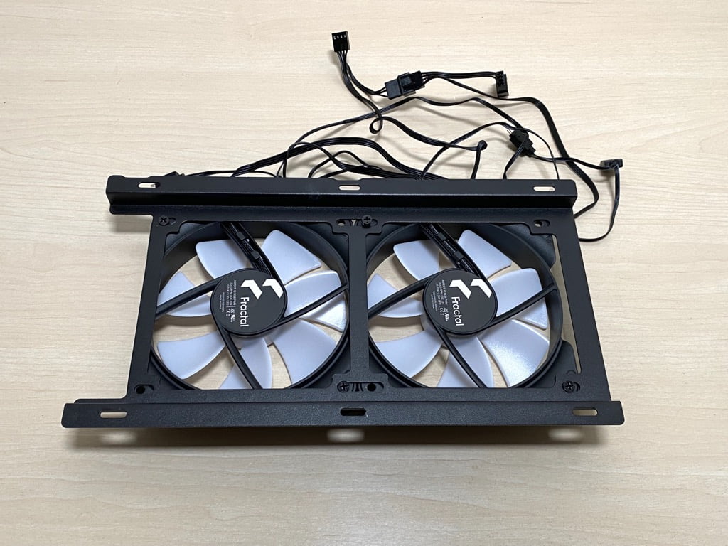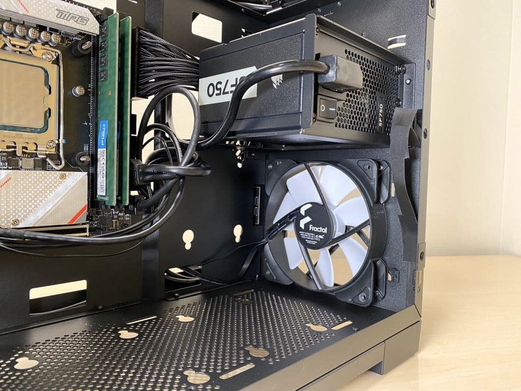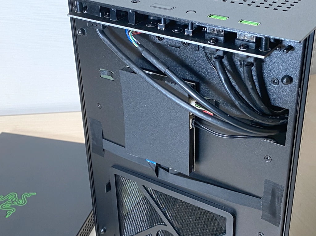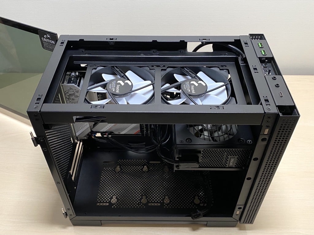 グラボのファンが底面から吸気するので、個人的にフロントのファンは不要かな … と思いました。
