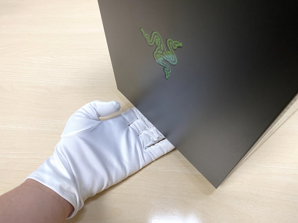 フロントパネルのRAZERロゴに配線は無く、「接触給電」で光ります。