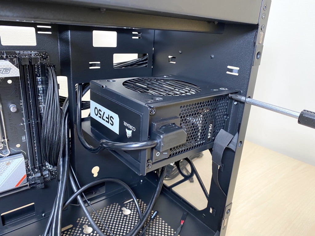 コルセアのSF750(レビュー)を使ったところ、写真のように電源の向きを上下逆さまにしないと中継ケーブルを差し込めなかったです。