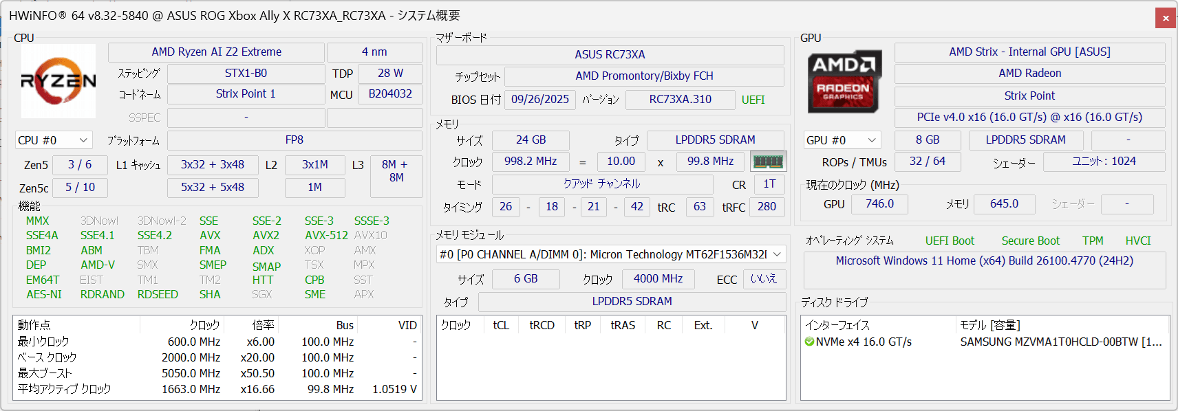| CPU | Ryzen AI Z2 Extreme Zen 5 8コア16スレッド | Ryzen Z2 A Zen 2 4コア8スレッド |